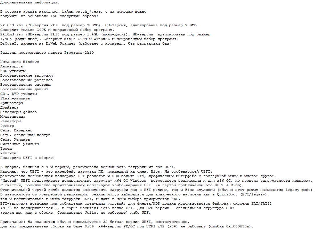 2k10 Live 7.40 — это универсальный мультизагрузочный диск, разработанный специально для системных администраторов и специалистов по восстановлению систем. Программа объединяет в себе несколько PE-сборок, поддерживает запуск как с CD, так и с DVD или USB-накопителя. Благодаря поддержке UEFI и широкому набору инструментов, 2k10 позволяет эффективно устранять сбои, восстанавливать данные и работать с операционными системами Windows в автономном режиме.