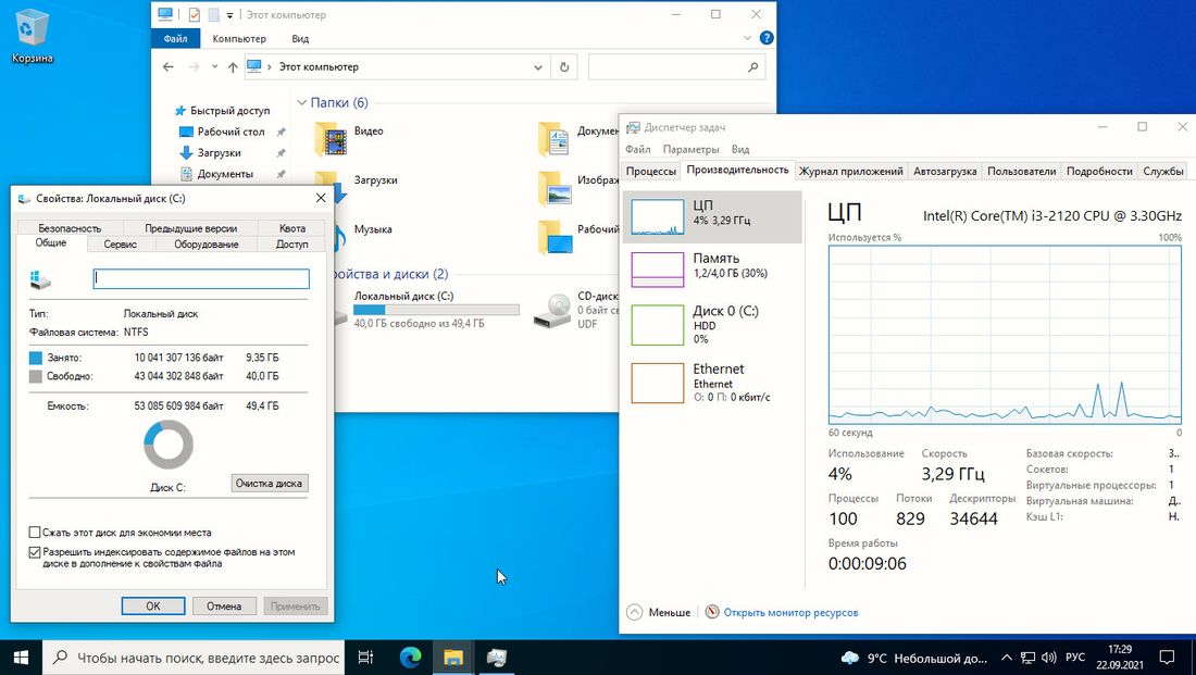 - Настройки системы оптимизированы: отключено автоматическое обновление, индексирование и резервирование места под обновления.