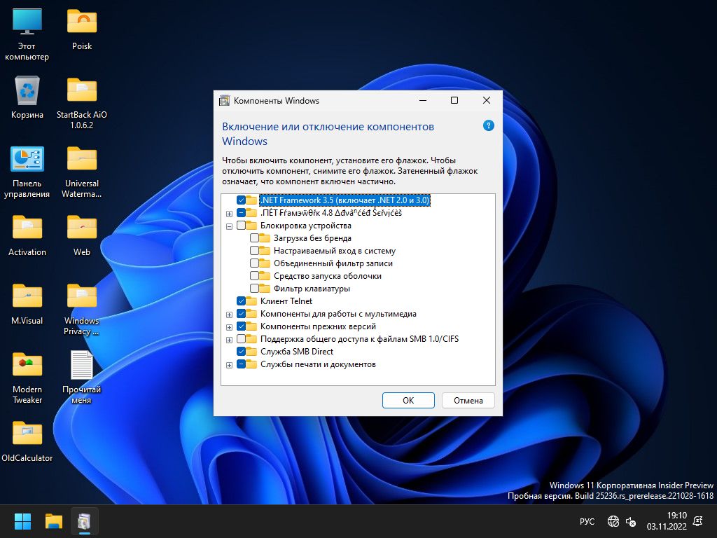 После установки система готова к использованию без дополнительных настроек. На рабочем столе размещены утилиты, облегчающие дальнейшую настройку: Modern Tweaker для тонкой оптимизации, Windows Privacy Dashboard для контроля конфиденциальности и KMS-активатор на случай сбоя автоматической активации. Также доступен классический калькулятор и поисковый инструмент Everything, ускоряющий поиск файлов. Пользователи могут сразу начать работу, не тратя время на отключение ненужных функций или установку необходимых компонентов вроде NET Framework 3.5, который уже включён.