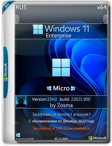 Сборка Windows 11 Enterprise x64 Micro 22H2 22621.900 от Zosma — это оптимизированная версия операционной системы, предназначенная для пользователей, которым важна производительность и контроль над системой. Образ основан на официальных компонентах Microsoft, но лишён множества ненужных функций, служб и приложений, что делает его значительно легче стандартной версии. Установка возможна даже на оборудование, не поддерживающее требования Microsoft — в частности, отсутствует необходимость в Secure Boot и TPM 2.0, что особенно ценно для владельцев старых компьютеров.
