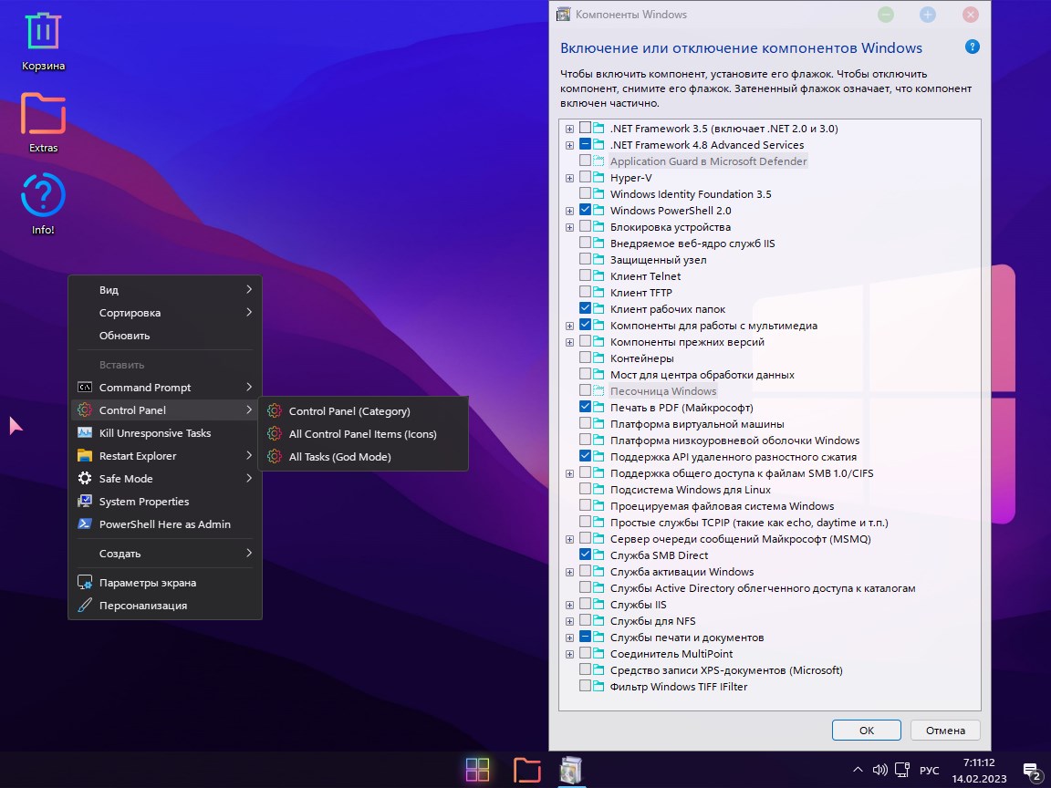 - Отключен Защитник Windows, телеметрия, смарт-реклама и фоновые службы, не влияющие на работу.