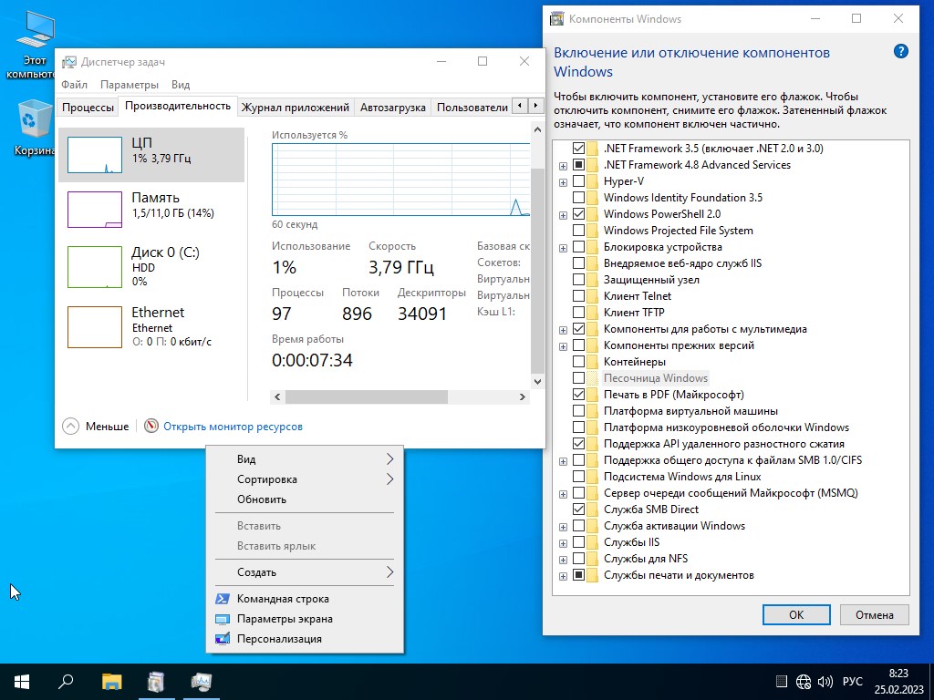 - Удалены ненужные приложения, включая Cortana, Edge, Teams и магазин приложений