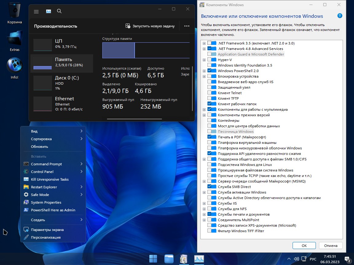 - Полный контроль над системой: отключение телеметрии, CIP, BitLocker, индексирования