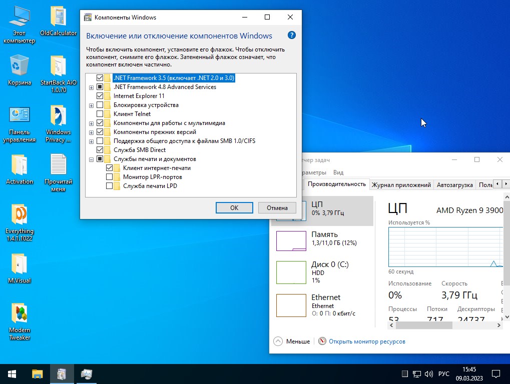 - Включён .NET Framework 3.5 и увеличен кеш файловой системы для ускорения запуска программ