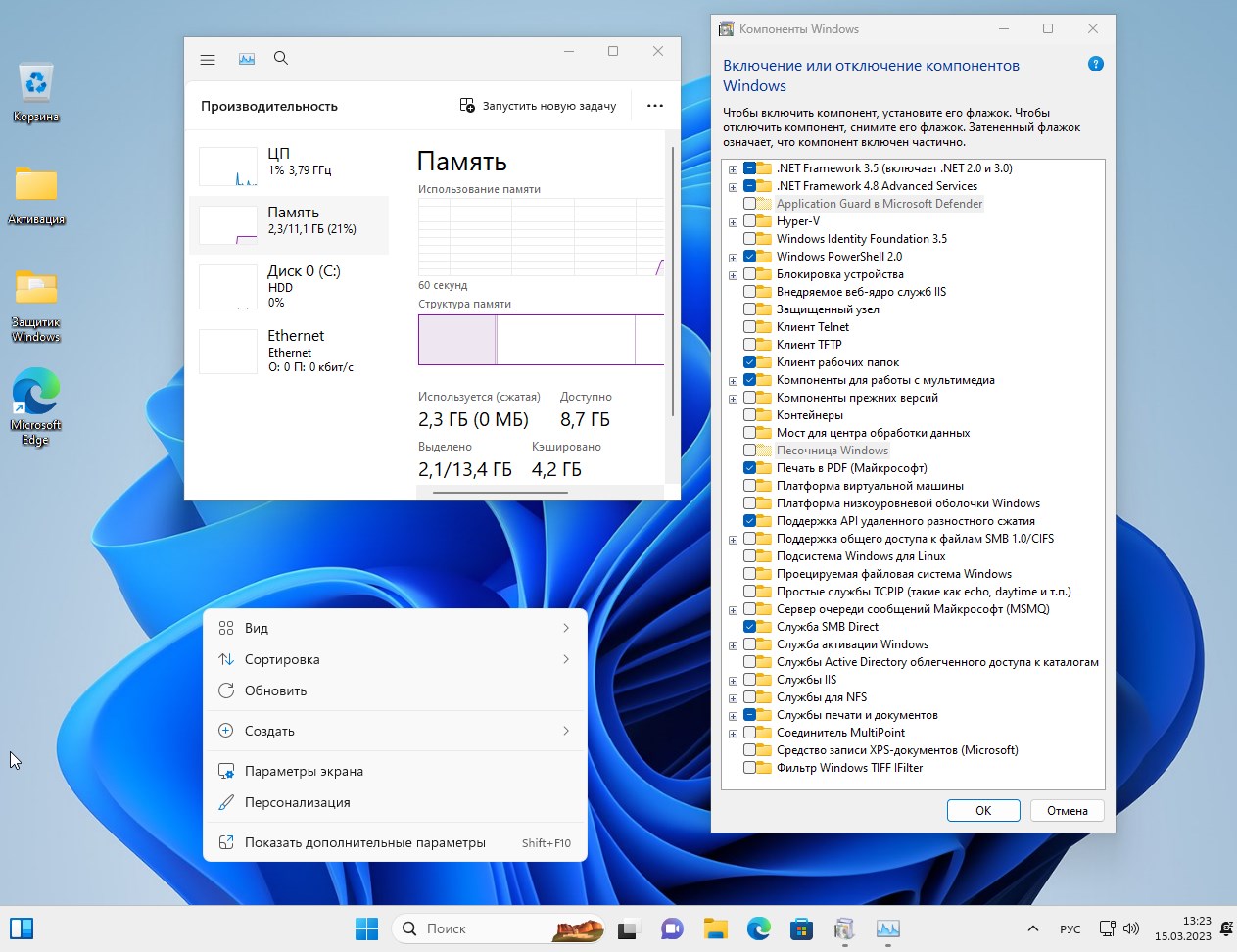 Windows 11 22H2 Build 22621.1413 — стабильная сборка операционной системы от Microsoft, вышедшая в марте 2023 года. Включает все обновления до 14 марта, поддерживает установку без TPM 2.0 и других аппаратных ограничений, доступна во всех основных редакциях — Home, Pro, SE, Enterprise, Education, IoT Enterprise. Система поставляется с предустановленными компонентами .NET Framework 3.5, Visual C++ 2005–2022, DirectX 9c, SmartFix 2.4.7, Microsoft DaRT, Games Pack и новым браузером. Минимальное вмешательство в оригинальную систему обеспечивает стабильность и полную функциональность. Активация возможна через KMS или ключ, настройки безопасности и защитника можно изменить вручную.