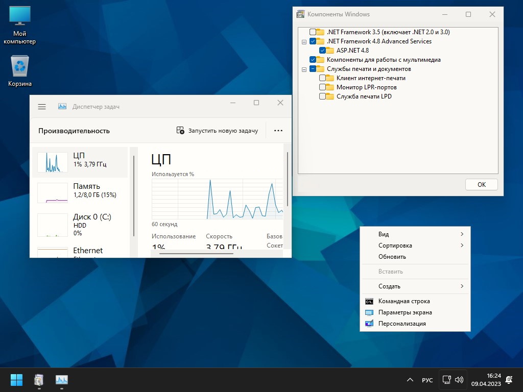 - В комплекте остались только необходимые компоненты: .NET Framework 4.8, Media Features, Windows Media Player и служба печати