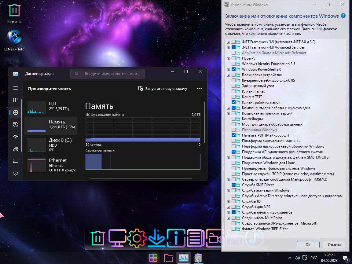 Одним из главных достоинств сборки является её универсальность и низкие системные требования. Она отлично работает как на современных ПК, так и на ноутбуках 10-летней давности, обеспечивая плавную анимацию, быстрый запуск приложений и стабильную работу в многозадачном режиме. Благодаря отключению автоматических обновлений и фоновых процессов, система не тормозит со временем и не замедляется из-за фоновых задач. Неоновая тема и стильный дизайн интерфейса придают системе современный вид, а возможность установки UWP-приложений и поддержка WSA и WSL2 расширяют функциональные возможности. Установка русского языка выполняется легко, а наличие встроенных инструментов для настройки даёт полный контроль над конфигурацией.