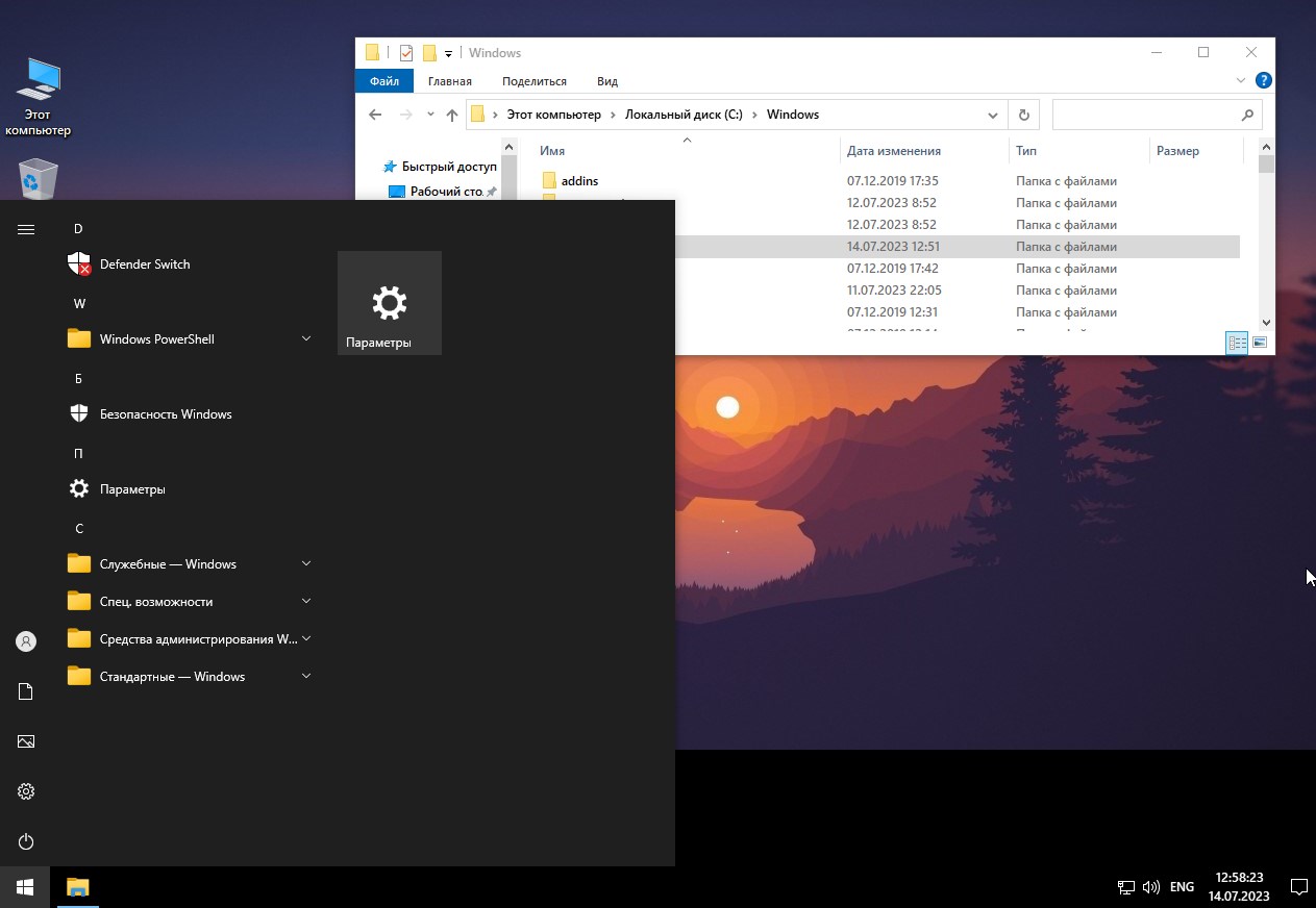 После установки пользователь получает готовую к использованию систему без необходимости вносить лишние правки. Поиск в Windows доступен, но иконка на панели задач скрыта — вызвать его можно через клавишу Win или команду в Пуске. Защитник Windows отключён по умолчанию, но при необходимости его легко активировать через встроенную утилиту “Defender Switch” в меню Пуска, после чего потребуется перезагрузка. Установка драйверов осуществляется стандартно — через диспетчер устройств или с флешки. Модифицированный контекстное меню не содержит лишних пунктов, а интерфейс приближен к классическому виду. Все файлы и папки открываются мгновенно, история просмотра отключена, UAC удалён — это делает работу более плавной и не прерывается предупреждениями. Поддержка DirectX, .NET Framework 3.5 и необходимых кодеков включена, а экран легко настраивается под нужное разрешение.