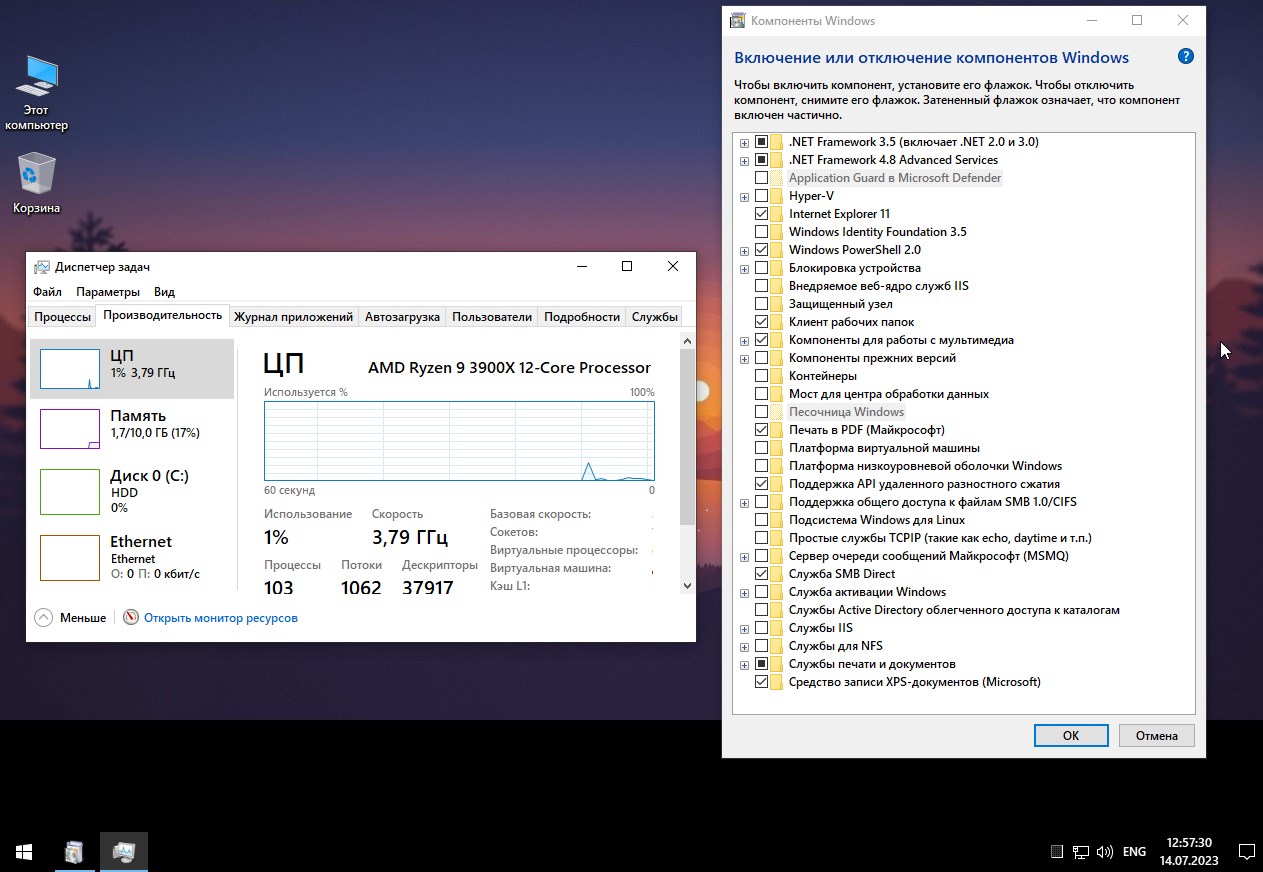 - Удалены ненужные компоненты: Microsoft Edge, Cortana, Xbox, OneDrive и другие элементы, которые редко используются на стандартном ПК.