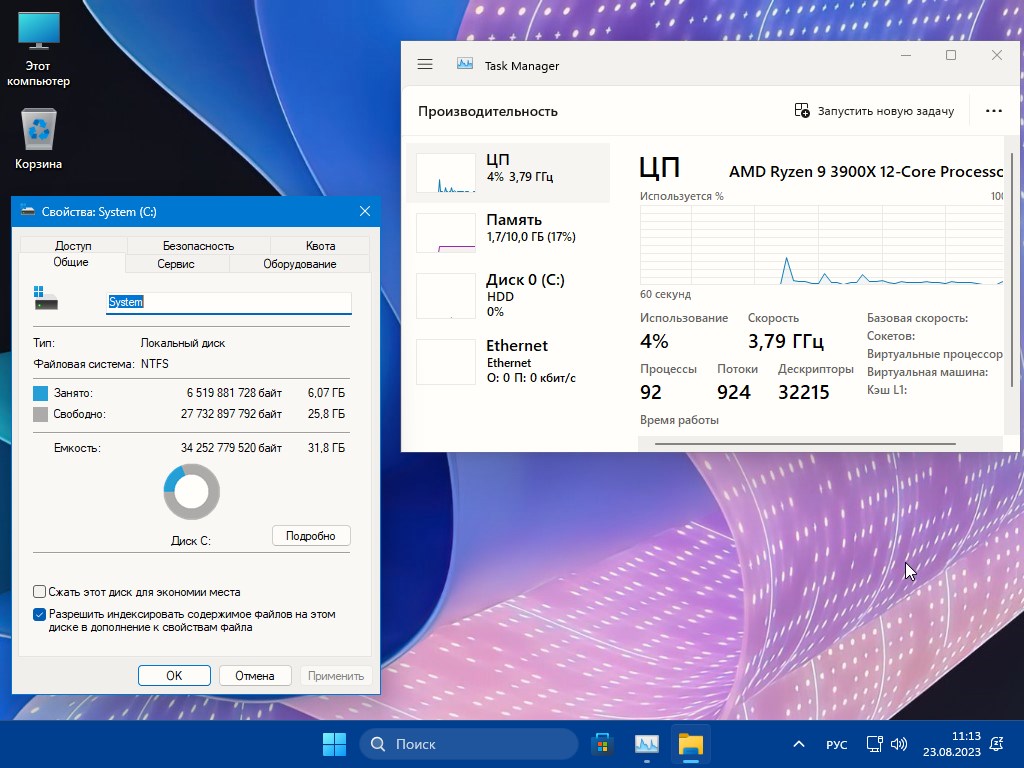 Система оптимизирована для максимальной производительности: отключена телеметрия, реклама, фоновые службы и ненужные процессы, влияющие на загрузку процессора и потребление ОЗУ.