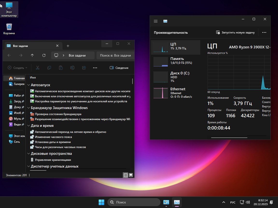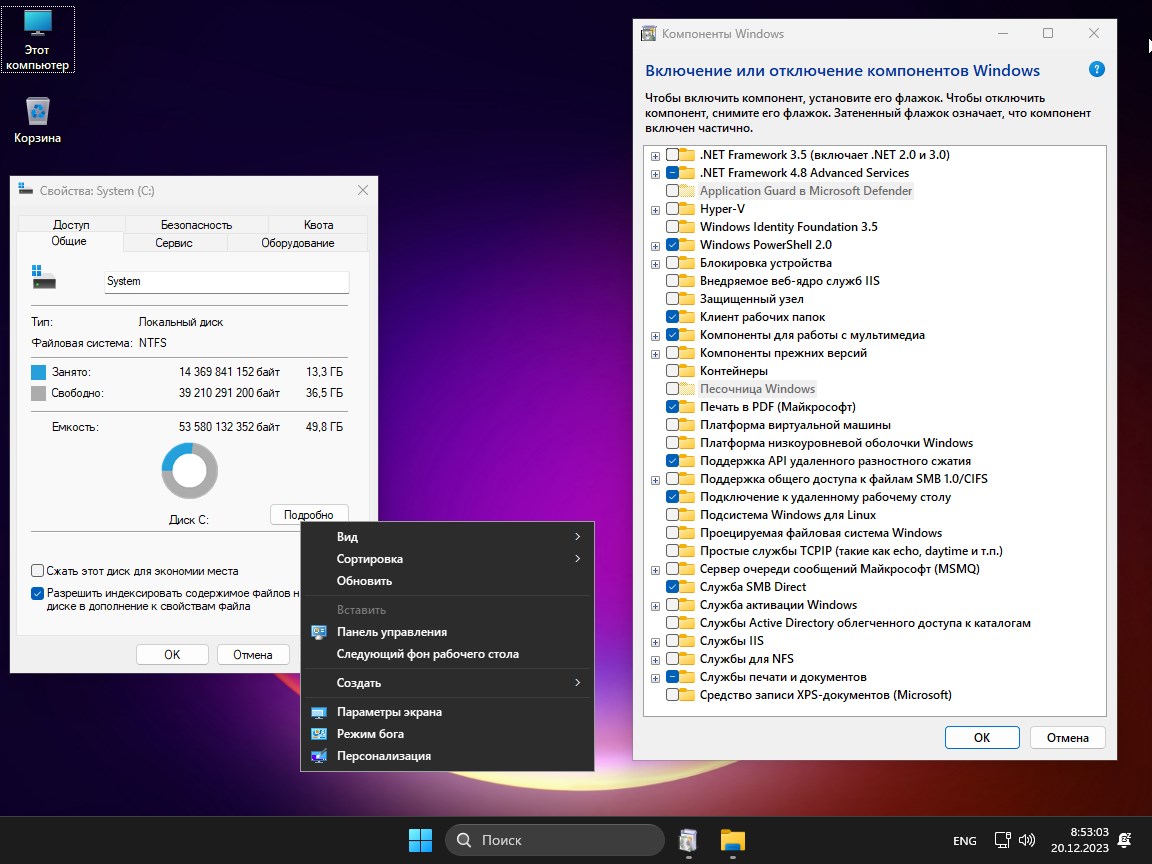 После загрузки образа Windows 11 23H2 его необходимо записать на флешку объёмом от 4 ГБ с помощью утилит, таких как Rufus, UltraISO или стандартных инструментов Windows. После записи загрузитесь с носителя, следуйте инструкциям установщика — ввод имени пользователя, пароля (по желанию), далее процесс продолжается автоматически без запроса ключа или подключения к интернету. Установка занимает несколько минут, после чего вы получаете готовую систему с рабочим столом, включающим все необходимые компоненты. Через меню «Пуск» можно включить или отключить Защитник Windows по необходимости. Контекстное меню дополнено полезными функциями: установка .cab-пакетов, извлечение .msi-файлов, прямой доступ к системным инструментам. Поиск работает корректно без Cortana, а интерфейс использует шрифт Segoe UI Semibold для улучшенной читаемости.