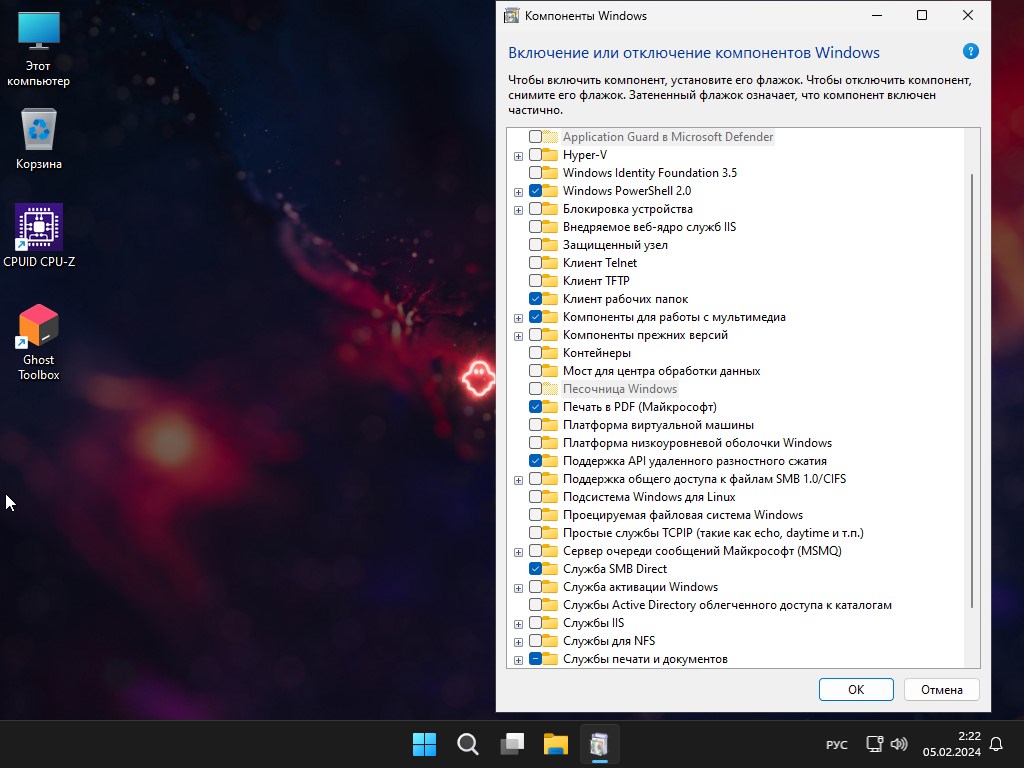 - Утилита Ghost Toolbox предоставляет простой доступ ко всем настройкам: от активации и включения Defender до установки необходимых библиотек и браузеров.