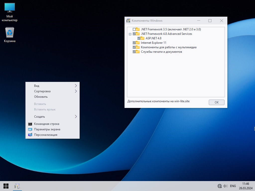 - Удалены Microsoft Store, OneDrive, Hyper-V, IIS, Defender и другие ненужные компоненты