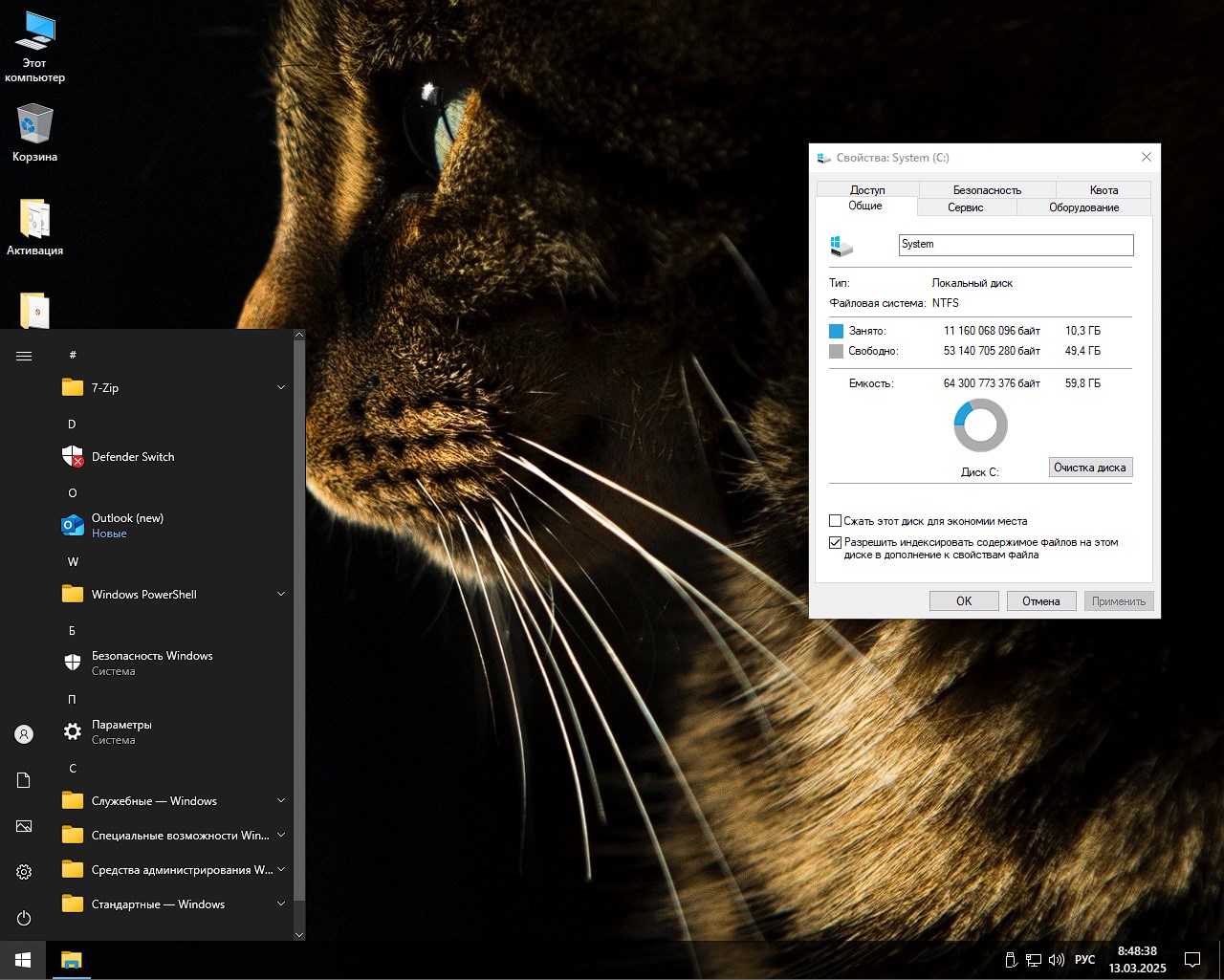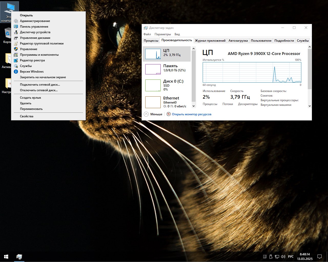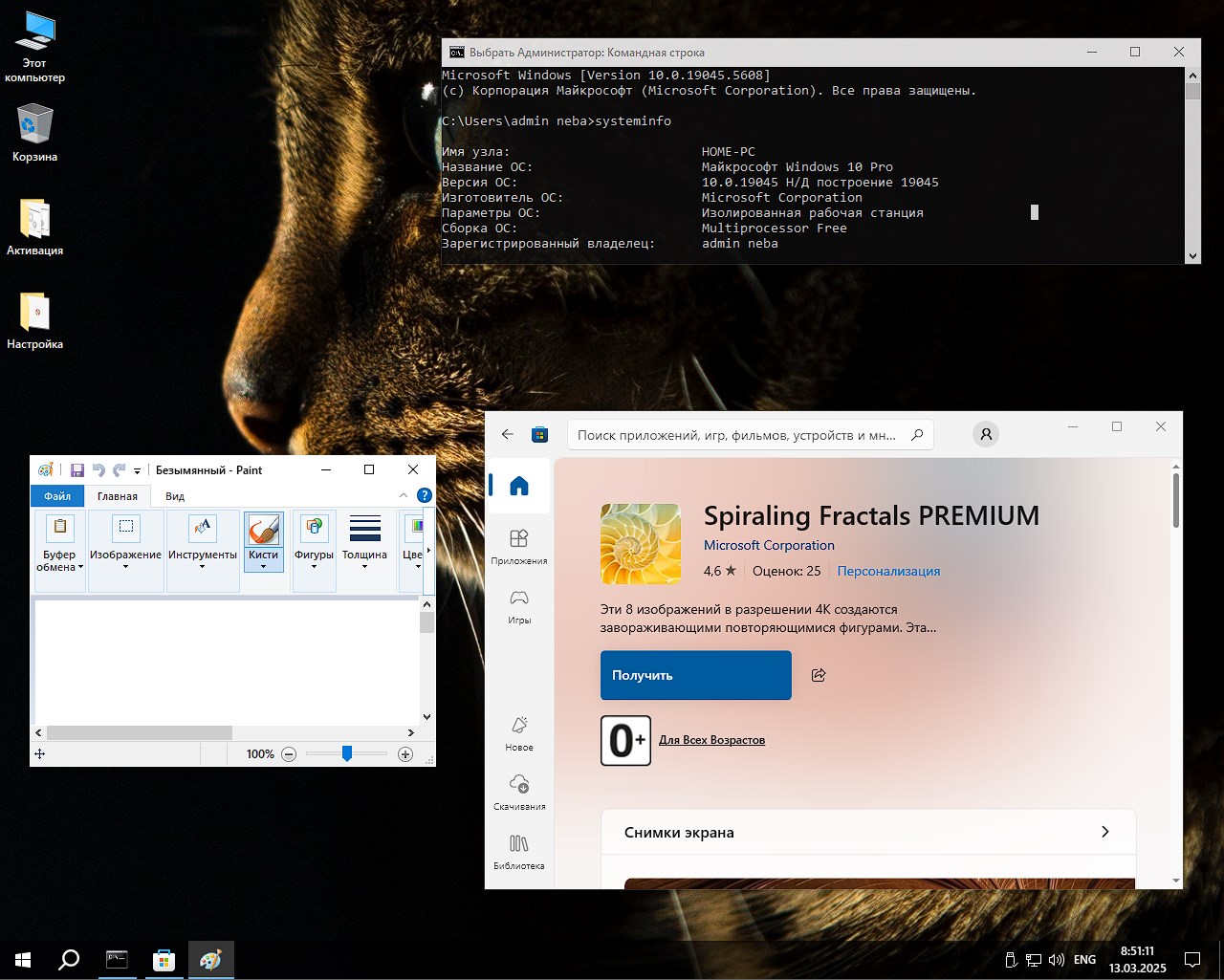 Установка системы осуществляется стандартным образом с помощью загрузочной флешки. Образ поддерживает UEFI и legacy режимы, устанавливается автоматически на оба типа конфигураций. После первой загрузки пользователь проходит минимальную настройку: ввод имени, при необходимости — пароля. Все дополнительные параметры уже предварительно настроены: отключены фоновые службы, удалена реклама, восстановлен классический интерфейс. По завершении установки становится доступен стандартный Windows PhotoViewer, а контекстное меню дополнено системными утилитами — regedit, msconfig, devmgmt.msc. Для тех, кто привык к Microsoft Store, предусмотрен способ его восстановления через команду wsreset -i в командной строке. Также на рабочем столе находится папка “Настройка” с Portable O&O ShutUp10 — инструментом для тонкой настройки приватности без последствий для системы.