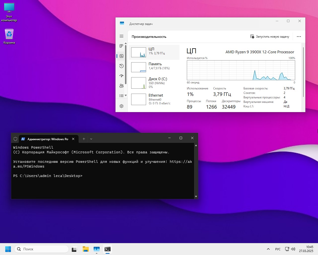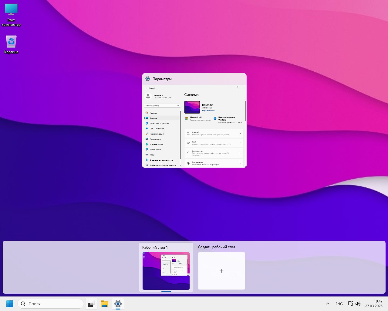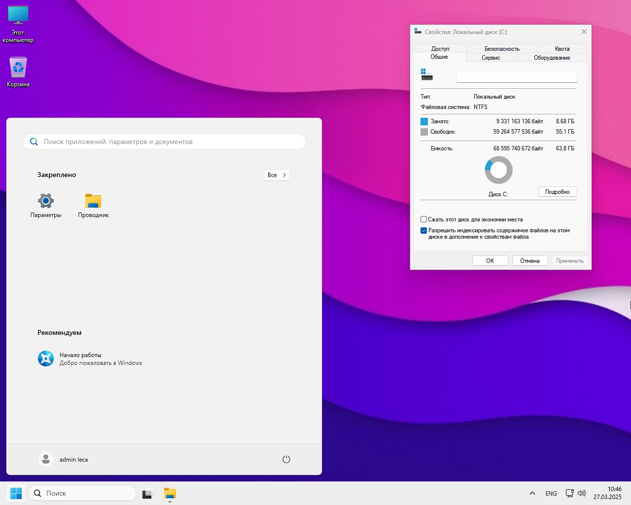 Сборка демонстрирует высокую производительность даже на аппаратных конфигурациях ниже минимальных требований Windows 11. Значительно снижено потребление оперативной памяти и размер файла подкачки — всего 1 ГБ. Интерфейс чистый и соответствует оригинальному дизайну Windows 11 Pro, но без рекламы, встроенных приложений и навязчивых системных процессов. Отключены Hyper-V, шифрование BitLocker, изоляция ядра и другие ресурсоемкие функции, которые редко используются в домашних условиях. Образ идеален как для повседневной работы, так и для использования в игровой среде благодаря отсутствию фоновых нагрузок.