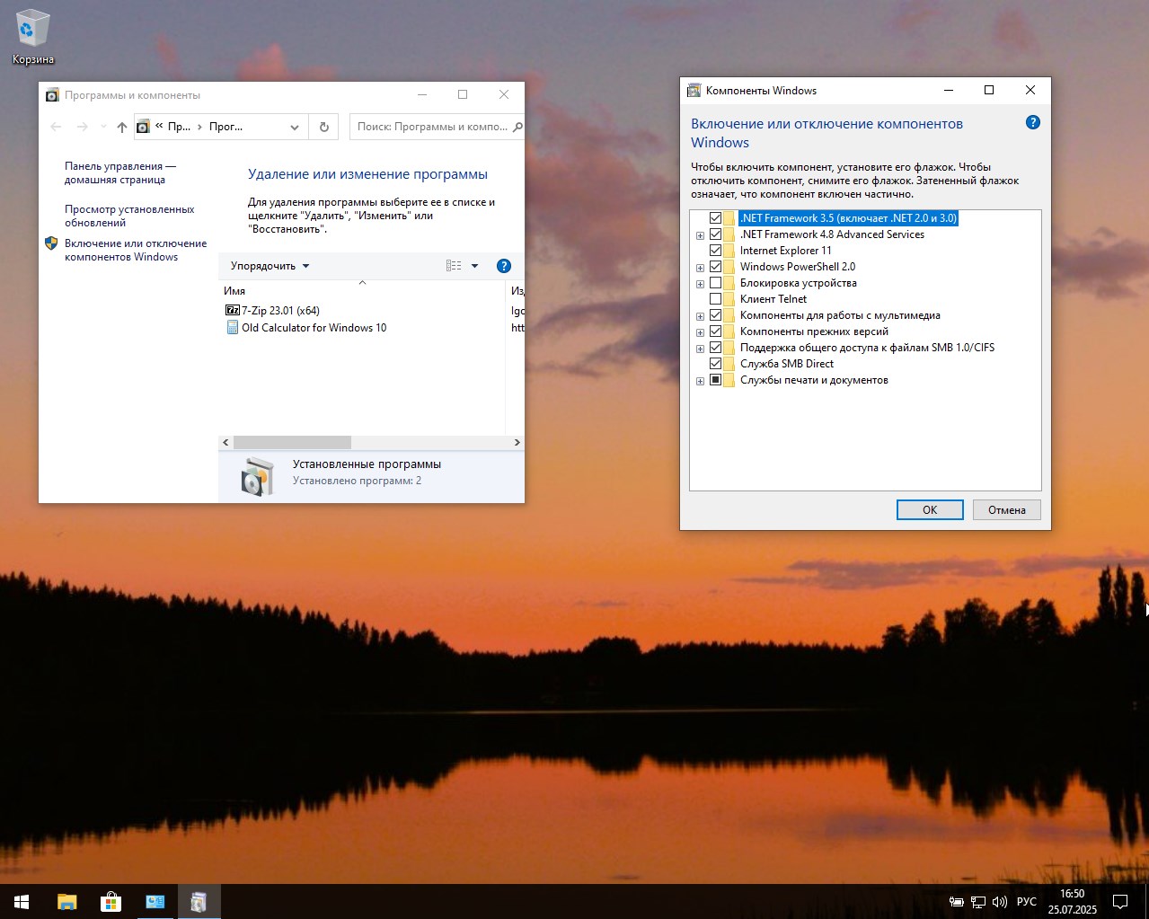 - Интегрированы необходимые компоненты: .NET Framework 3.5, драйвера для принтеров, DirectPlay, SMB1 и другие.