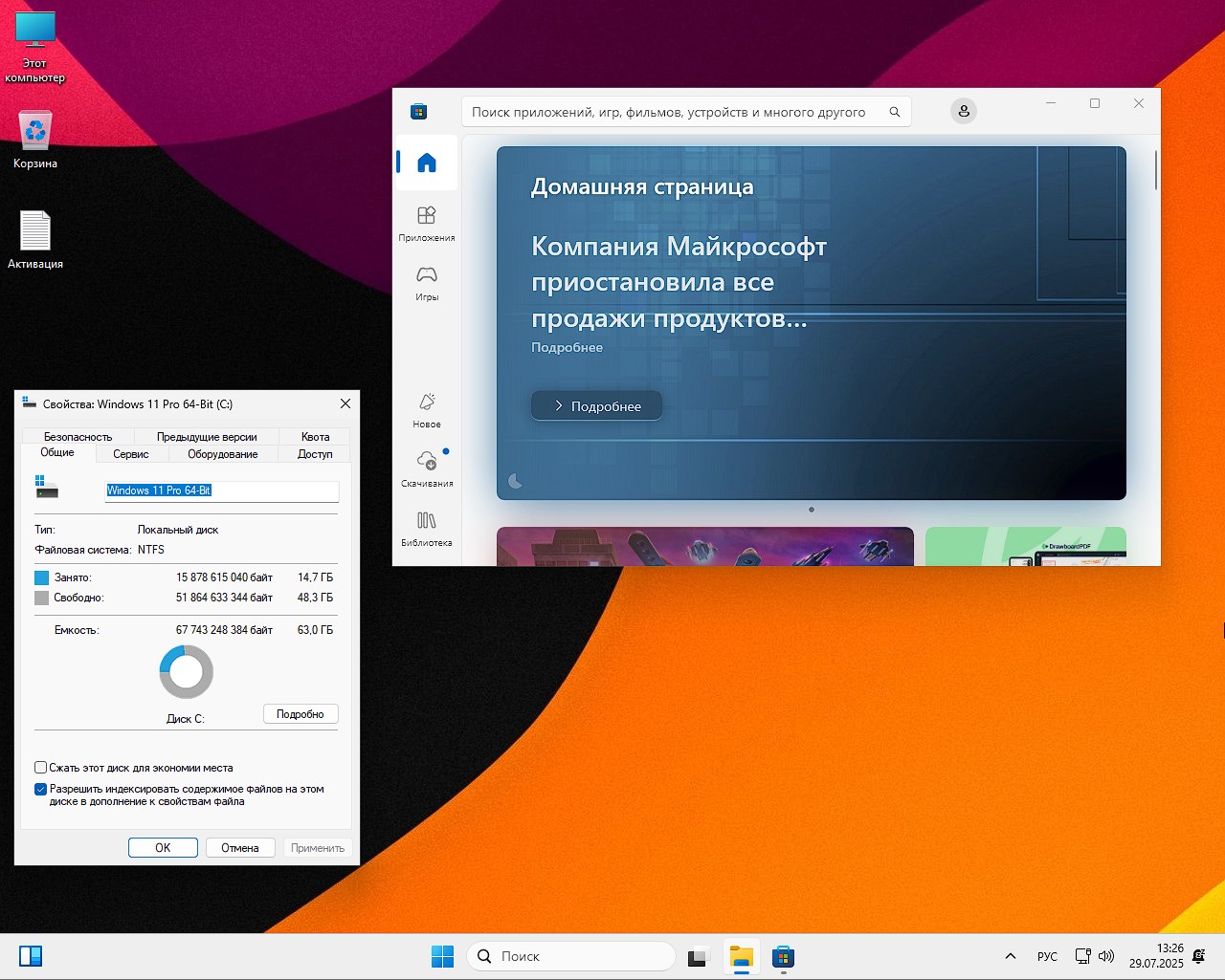 - Несмотря на оптимизацию, объем дискового пространства после установки превышает 20 ГБ, что может быть критично для устройств с малым SSD