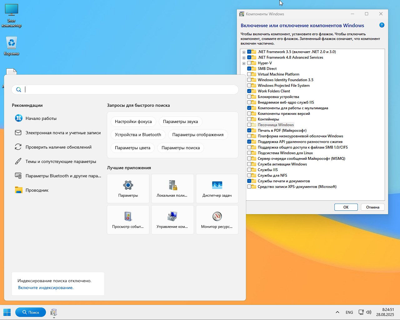 Сборка Windows 11 Pro x64 25H2 сочетает в себе высокую скорость работы, защищённость и комфорт использования. Оптимизация затронула не только визуальные элементы, но и системные службы: отключены WSearch, SysMain, GameDVR, что положительно сказывается на отзывчивости системы, особенно на устройствах с HDD. Удаление встроенного антивируса Defender и SmartScreen дало прирост производительности, особенно при распаковке архивов и запуске тяжёлых приложений. Настройки соответствуют требованиям пользователей, которые ценят контроль над своей системой, без вмешательства со стороны Microsoft. При этом отсутствие некоторых компонентов, таких как восстановление системы или магазин, может быть неудобным для новичков, привыкших к стандартному функционалу.