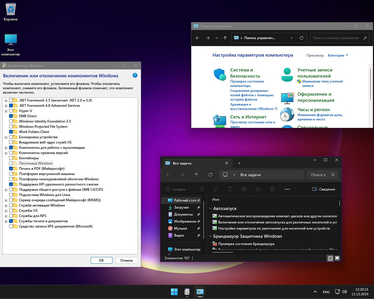 Windows 11 24H2 Pro + IoT Enterprise x64 — это оптимизированная сборка операционной системы для пользователей, ценящих производительность, стабильность и приватность. Основанная на оригинальных образах Business Editions, редакция предлагает полную очистку от телеметрии, дефолтных приложений и фоновых служб. Установка возможна без TPM и Secure Boot, а благодаря отключению Защитника Windows и Edge обеспечивается минимальное потребление ресурсов. Система идеально подходит для старых и новых компьютеров, включая ноутбуки, и поддерживает полную русификацию. Образ вышел в декабре 2025 года и содержит все важные обновления по 10 декабря.